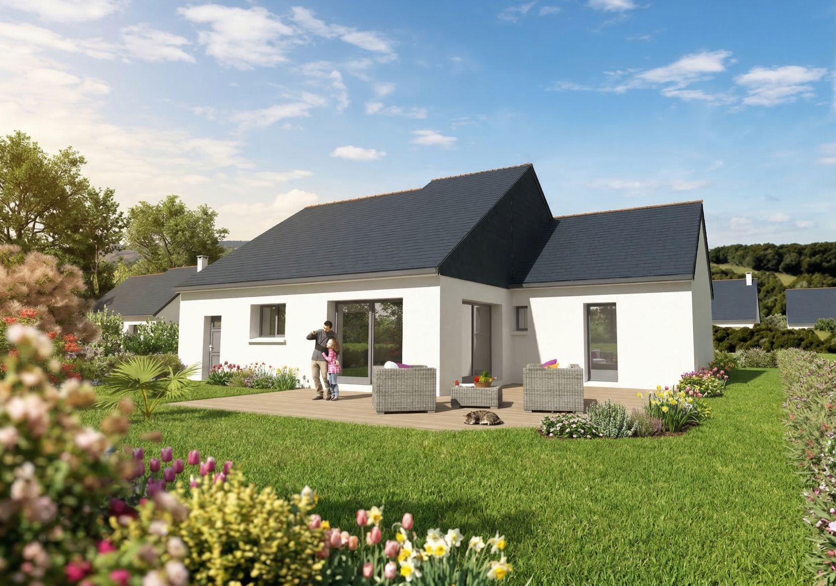 Prix avec assurance dommages-ouvrage comprise, terrain viabilisé, raccordements aux réseaux compris, frais de notaire compris. Terrain sélectionné et vu pour vous sous réserve de disponibilité et au prix indiqué par notre partenaire foncier. Conditions et visuels non contractuels.